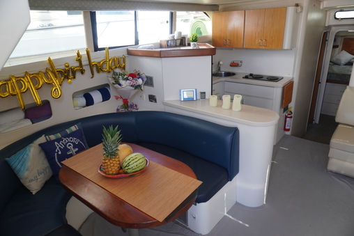 2 Bedrooms, 1 Bath, 1 outside shower, A/C, stove, microwave, fridge. Fly Bridge (2nd level). Sundeck accesible via a central stair.